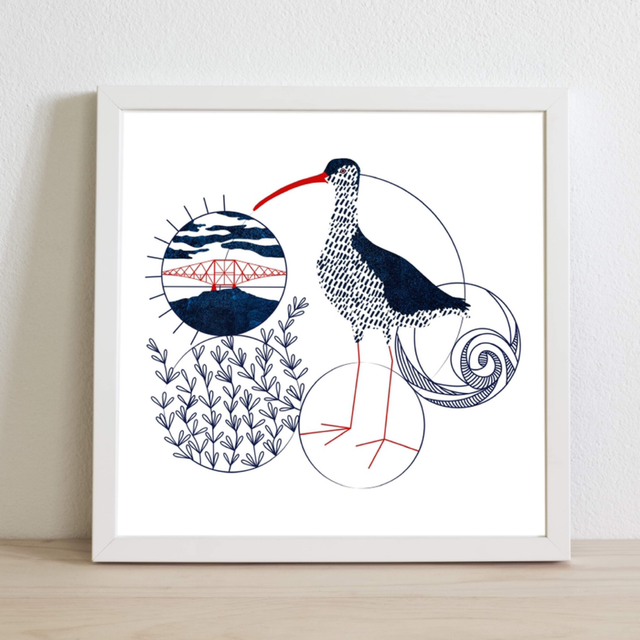 Featured are the Fife Rail Bridge and a frequent visitor, the Curlew. An 8x8 inch giclee print, printed on Somerset Velvet matt heavyweight textured paper. Displayed in a window mount and protected in a compostable sleeve. Will fit standard frame.