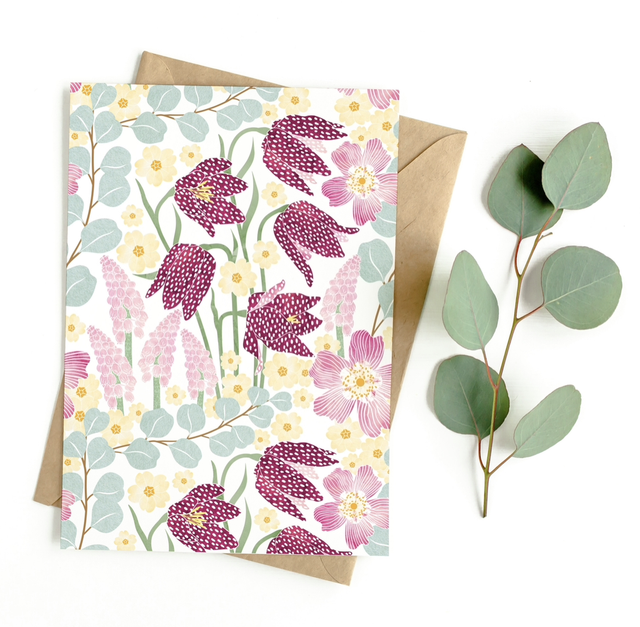 Spring Flowers repeat pattern design printed on cardstock from sustainable forests, with a white envelope in a compostable sleeve. 105x150mm (A6)